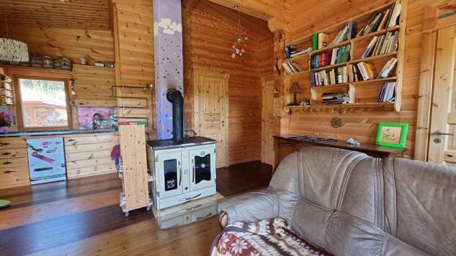 • Zrub (70 m²): postavený z kvalitnej arktickej borovice, zateplený ovčou vlnou, so zelenou strechou s miernym spádom. Má samostatné súpisné číslo, zapísaný ako rekreačná chata. • Dispozícia prízemia: prestrešená terasa, kuchyňa spojená s obývačkou, technická miestnosť, kúpeľňa so sprchou a suchým WC, dve izby. • Suterén: státie pre auto, sklad dreva, voľný priestor na ďalšie využitie. • Sauna: originál fínska saunová pec na drevo. • Domček (3 × 3 m): na stĺpikoch, s úložným priestorom pod domčekom. • Pivnica: vstavaná do zeme, dve oddelené miestnosti. • Chlebová pec: prekrytá strechou, s vedľajším skladom dreva. • Jazierka: okrasné, leknové a plávacie s hĺbkou 1,8 m. • Záhrada: úžitková záhrada s ovocnými stromami, skleníkom a nádržami na dažďovú vodu v zemi. • Energetická sebestačnosť: fotovoltický systém s 15 panelmi – napája čerpadlo aj ohrev vody. • Teplá voda: 100-litrový bojler napájaný elektrinou z fotovoltiky a výmenníkom z pece. • Kúrenie: krbová pec s výmenníkom a radiátormi, slúži aj na varenie a pečenie. • Internet: satelitný (parabola). • Voda: z vlastného vrtu – kvalitná pitná voda.