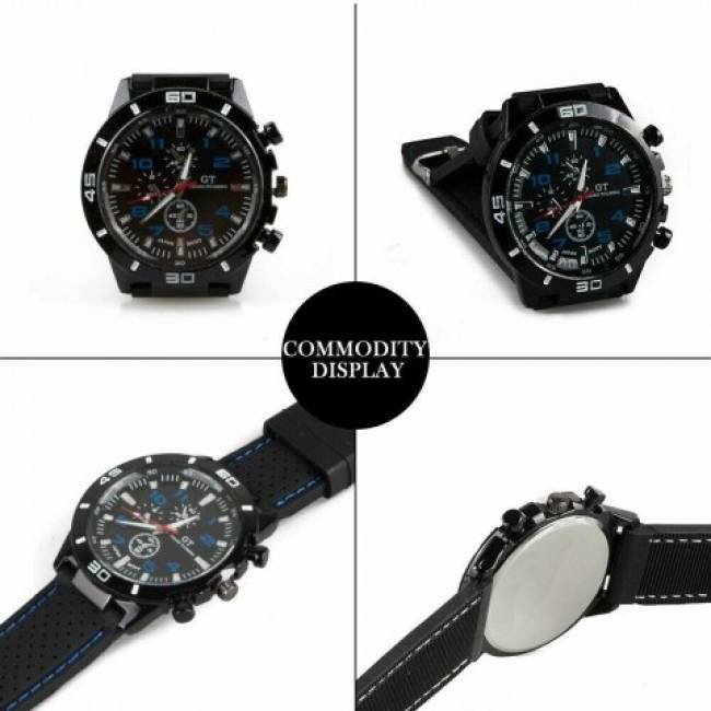 Pánske elegantné športové náramkové hodinky z nerezovej ocele Grand Touring sú určené pre elegantných mužov, ktorí zároveň preferujú športový a aktívny štýl. Quartz strojček, kvalitný silikónový zdobený remienok s príjemnou povrchovou úpravou SilkTouch dĺžky 24,5 cm s farebným vzorom na kraji remienka ladí s farebne značeným číselníkom v ciferníku priemeru 2,2 cm. Remienok má klasické upínanie cez kovovú sponu, pomocou dierok si potom môžete zvoliť, aká dĺžka opasku vám vyhovuje najviac. Tvrdené minerálne sklíčko. Japonský quartz strojček. Vhodné pre každodenné použitie pri rôznych voľnočasových a vnútorných aktivitách, ako sú obchodné rokovania, večierky, nákupy atď. Je to perfektný darček k narodeninám pre priateľov, kolegov alebo otcov. Dostupné farby: červená, žltá, zelená, bielo-modrá Priemer ciferníka: 4,3 cm Šírka remienka: 2,1 cm a dĺžka remienka: 24,5 cm Váha 50 g