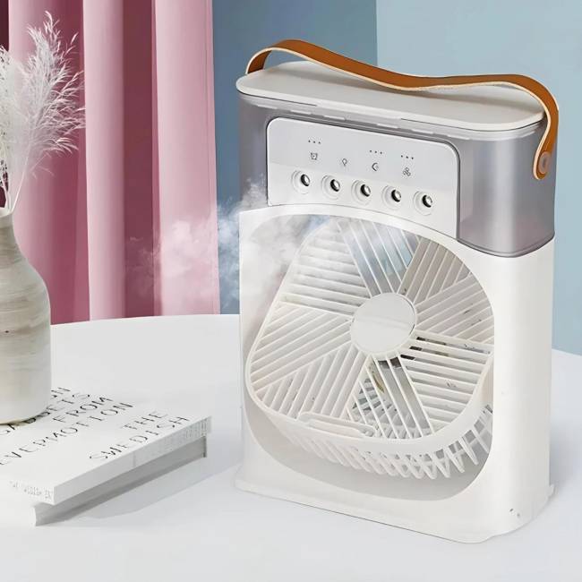 Táto prenosná klimatizácia 5 v 1 je kombináciou zvlhčovača vzduchu, aróma difuzéra (pridaním arómy do vody v nádržke), nočného svetla (7 rôznych farebných podsvietení), klimatizácie a stolného ventilátora.